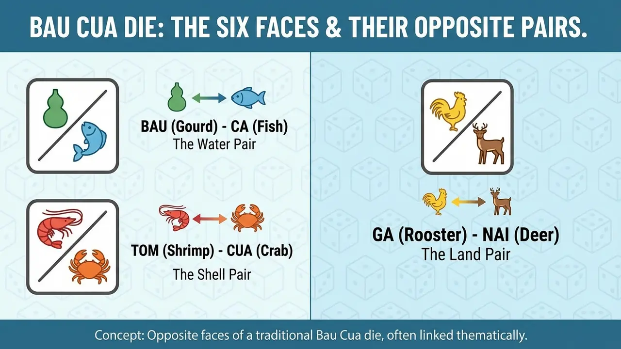 Đây là một chiến thuật kinh điển dựa trên cấu tạo vật lý của xúc xắc Bầu cua truyền thống. Các cặp mặt đối diện thường được quy ước như sau: